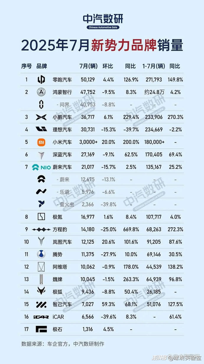 以理想為例,其作為增程路線的堅(jiān)定踐行者,如今卻面臨巨大壓力。今年7月,理想交付量同比暴跌,從去年的5萬(wàn)輛下滑到了3萬(wàn)輛左右,排在了新勢(shì)力品牌銷量榜的第四。而在2024年,在不考慮鴻蒙智行品牌的前提下,理想從未跌出“前三”。