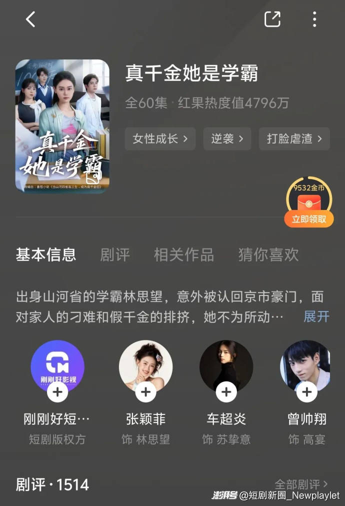 《真千金她是學(xué)霸》是近期一個非常具有代表性的案例。這部劇在紅果上線后,首周即登頂熱播榜第一,觀看量突破20億。