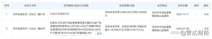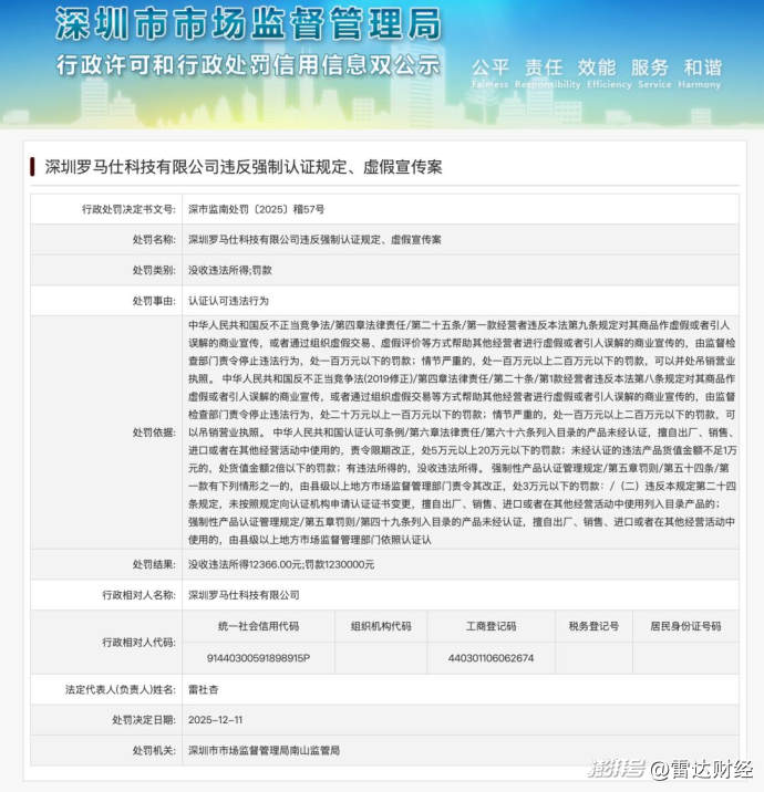 雷達(dá)財(cái)經(jīng)從深圳市市場(chǎng)監(jiān)督管理局網(wǎng)站獲悉,12月11日,深圳羅馬仕科技有限公司因違反強(qiáng)制認(rèn)證規(guī)定、虛假宣傳案,被深圳市市場(chǎng)監(jiān)督管理局南山監(jiān)管局沒收違法所得1.2萬余元、罰款123萬元。