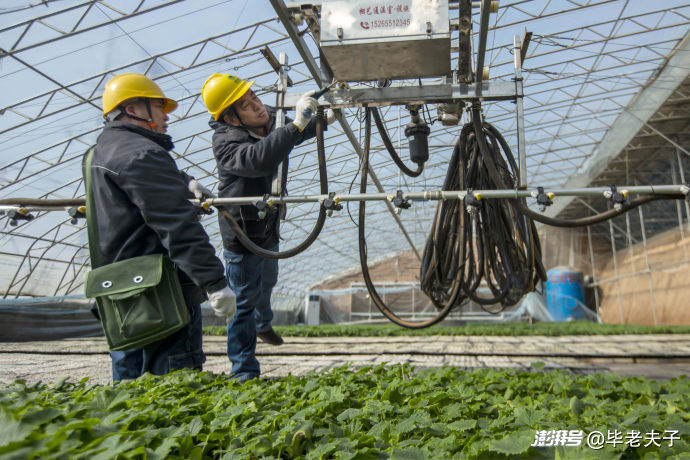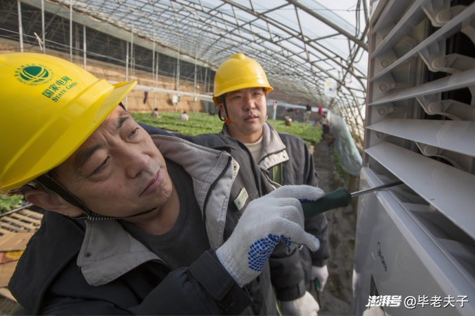 圖為電力員工王清錄與同事正在對(duì)大棚內(nèi)通溫設(shè)備的用電設(shè)施進(jìn)行檢修。