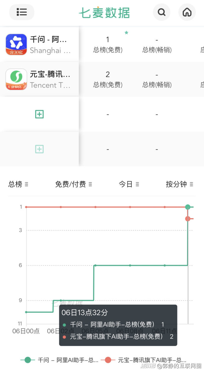七麥數(shù)據(jù)顯示,2026年2月6日下午1點32分,阿里巴巴旗下的AI助手產(chǎn)品千問反超元寶、豆包,登頂App Store免費總榜單第一。