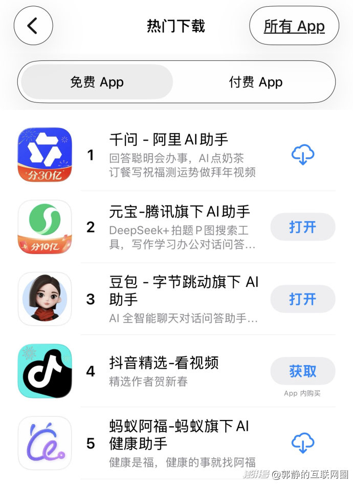 App Store免費總榜單排名中,前五款有四款都是AI助手產(chǎn)品,第一到第五名分別是:千問、元寶、豆包、抖音精選、螞蟻阿福。