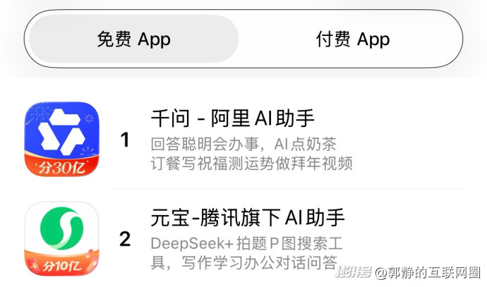 下午1點32分,千問反超元寶、豆包,登頂App Store總榜第一