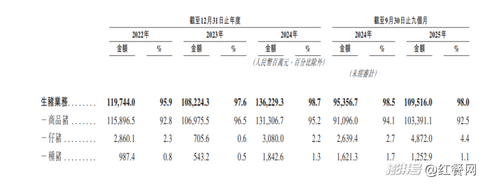 生豬業(yè)務(wù)是公司營(yíng)收的絕對(duì)支柱,貢獻(xiàn)超9成收入。招股書(shū)透露,2022年、2023年、2024年及2025年前9月,生豬業(yè)務(wù)收入(于分部間抵銷(xiāo)前)分別為1197.44億元、1082.24億元、1362.29億元、1095.16億元,占總收入的95.9%、97.6%、98.7%、98.0%。