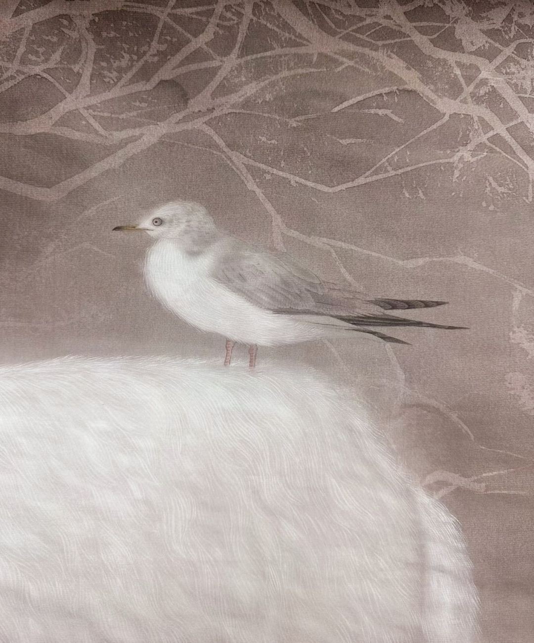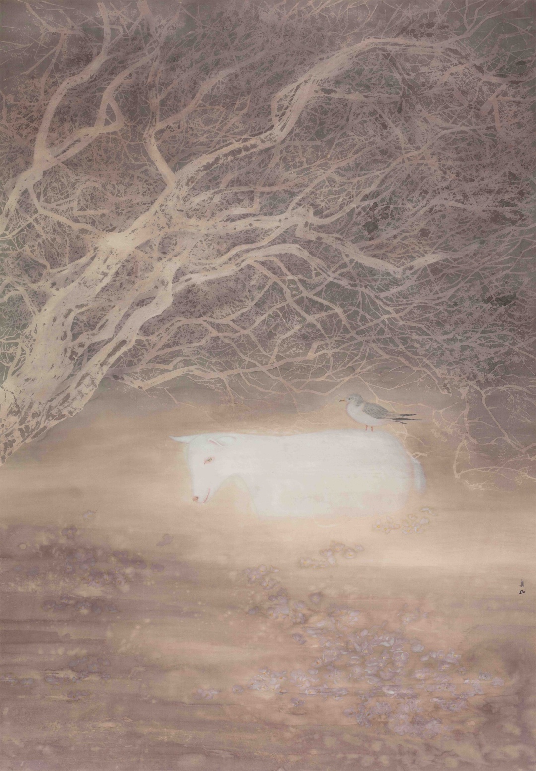 《靈光獨(dú)耀—寂》是我心底悄然生長(zhǎng)的獨(dú)白,不同于我以往任何一幅寫生,它更像是我與自己的一次靜默對(duì)話。世間紛擾如潮,信息過剩如藤蔓纏繞,枝枝丫丫、密密匝匝,幾欲將人裹挾其中。而居于畫面中央的那只小羊,是靈魂深處依然澄澈的“神性”——縱然身處泥淖,依然可以開出潔白的小花;縱然離群獨(dú)行,身后也始終跟著一個(gè)小小的身影,從未離去。這一束光,是深處黑暗中的安慰。