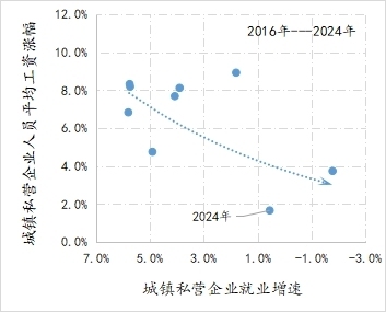 其次,居民收入預(yù)期嚴(yán)重偏離趨勢線。以城鎮(zhèn)私營部門的“菲利普斯曲線”為例,2024年,城鎮(zhèn)私營企業(yè)的就業(yè)增速為0.6%,平均工資增速不足2%(1.7%),低于趨勢線的水平。