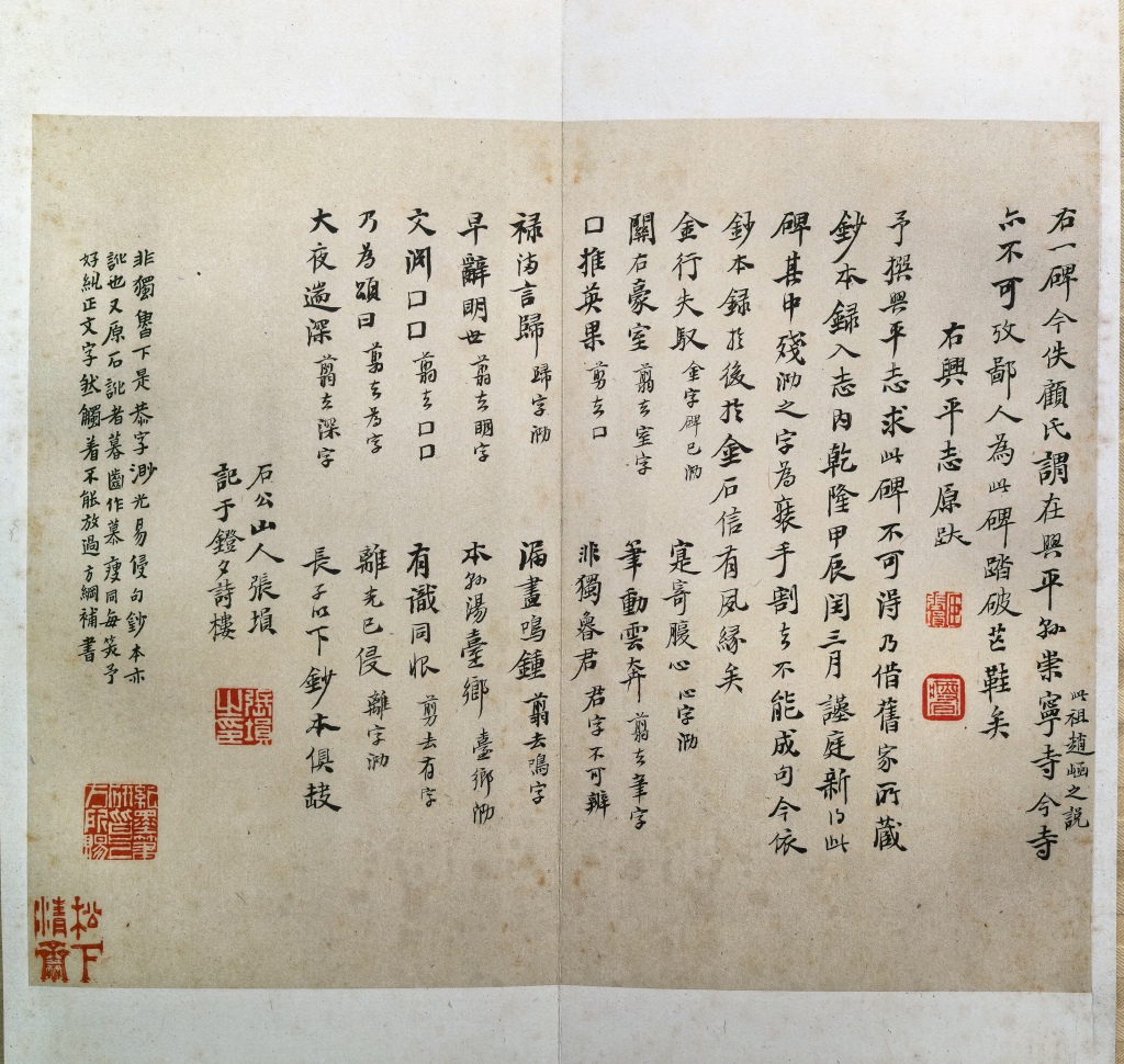 又據(jù)羅氏記述,其丙辰年(1916)題徐氏整紙印本時(shí)所錄舊日校記,似當(dāng)為壬子(1912年)秋以費(fèi)屺懷(念慈)藏本校張叔未(廷濟(jì))錄文所得者,計(jì)“補(bǔ)釋三字,正張釋之訛者十一字”,較前述其宣統(tǒng)二年(1910)跋端方藏本時(shí)的“正訛釋者十有三,補(bǔ)釋者三”,稍有出入。今兩相核對(duì),知羅氏于端方藏本題跋中所列“(第四葉)四行‘寧唯王阜’,‘唯’訛作‘惟’”,“第五葉一行‘神璽鄉(xiāng)’,‘璽’字訛作‘皇’(此據(jù)別本釋之,是本‘神’下一字為褾工截去)”,以及“第八葉‘第二子石州司戶參軍事榮’,‘石州’訛作‘原州’”三條,皆為其題徐氏整紙印本跋文中所無;而羅氏跋徐氏整紙印本中所舉“‘扇席承歡’,‘歡’訛作‘顏’”一條,亦不見于其為端方藏本所作題跋之中。今檢上圖陸恭舊藏、上圖端方舊藏及上博金冬心舊藏諸本,則“顏”字皆尚可辨,上博金冬心本內(nèi)且有吳氏小字旁注,曰:“‘扇席承顏’之‘顏’字,張尗未不誤,羅叔言誤‘顏’為‘歡’。湖帆校記?!?/p>