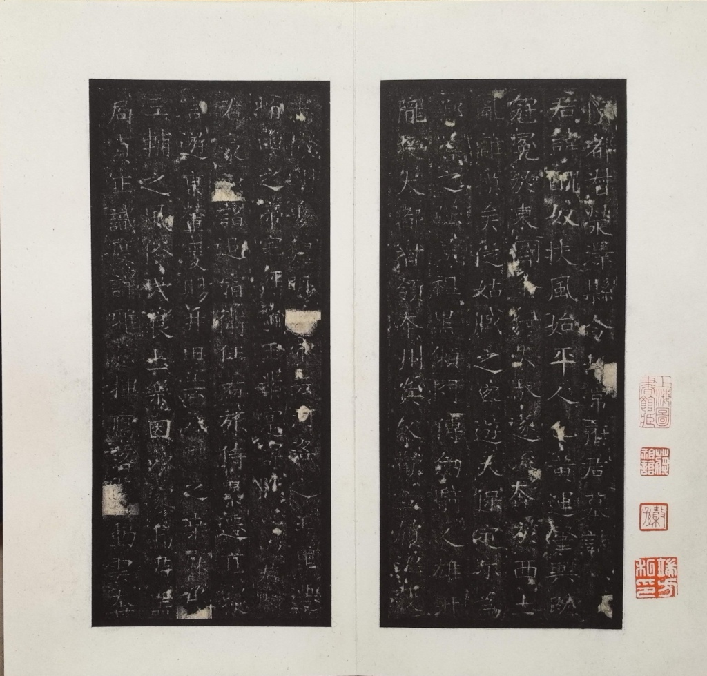 上述各本中,上圖端方本曾于“國(guó)家圖書館、上海圖書館藏碑帖名品”(上??萍嘉墨I(xiàn)出版社、國(guó)家圖書館出版社,2015年3月)系列中,影印出版,除略有放大之外,又可能欲使其原來比較模糊的字口筆畫顯得清晰而處理過度,致墨色與原本偏差稍大;上圖陸恭本二十多年前曾編入當(dāng)時(shí)上海圖書館仲威、沈啟治等編集的《隋墓志選萃》(湖北美術(shù)出版社,2001年2月)一書中,單色影印。上博金冬心本先收入人民美術(shù)出版社2010年1月出版的《中國(guó)碑刻全集》(4),后又作為“上海博物館藏碑帖珍本叢刊”第三輯(上海書畫出版社,2021年12月)的其中之一,單本成冊(cè),皆原色影印。今存私人藏家的整紙本,據(jù)桑椹先生《近代影印善本碑帖錄》(上海書畫出版社,2022年12月)著錄,則早在民國(guó)五年(1916)即已與另一劉聚卿(世珩)舊藏剪裱本以珂羅版黑白影印,合裝一冊(cè);后又由趙萬里先生輯入其《漢魏南北朝墓志集釋》(科學(xué)出版社,1956年1月)中,縮小石印。北大張伯英本的彩色縮印圖版,亦曾收入《北京大學(xué)圖書館藏歷代金石拓本菁華》(文物出版社,1998年4月)一書。而蘇博沈樹鏞本,則好像一向未見印行。