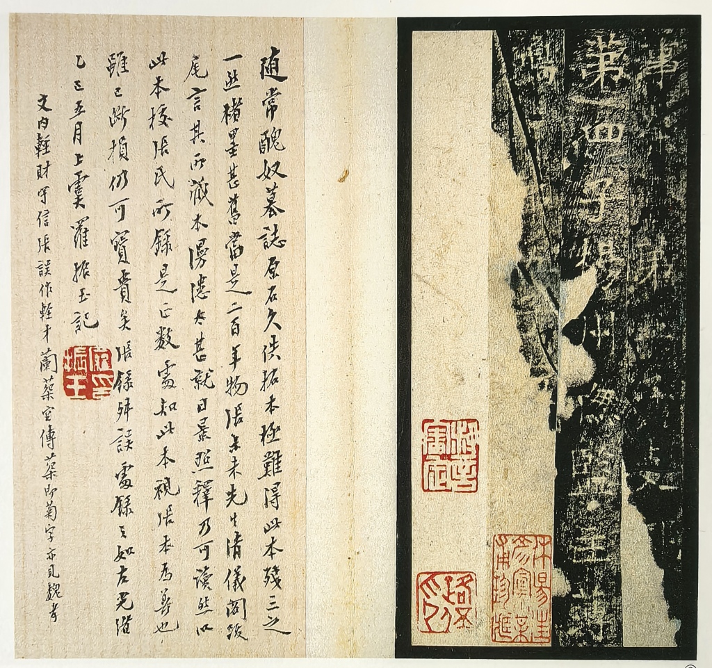 拓本流傳至罕,清張塤已有為訪此志踏破芒鞋而終不可得之語(yǔ),故王蘭泉、嚴(yán)可均、陸紹聞、陸星農(nóng)諸家,均未收錄。以羅叔言搜求之博,所見也僅三本:一為費(fèi)念慈(藏)本,一為劉聚卿藏本,一為南陵徐積余藏整紙本。以近世所見者,除此三本之外,尚有端陶齋藏本(曾歸皖江劉氏,現(xiàn)在上海圖書館),潘祖蔭藏趙?叔跋本(曾藏吳縣吳氏),陸謹(jǐn)庭舊藏本(有翁方綱跋,歸上海文管會(huì),現(xiàn)轉(zhuǎn)藏上海圖書館),以及最近在蘇州博物館所見沈均初舊藏毛意香跋本,其余未所聞見。七本中以陸謹(jǐn)庭本及沈均初舊藏本為最精細(xì)。此志字跡較他志差小,書法妍麗。原石久佚,拓本流傳又僅此數(shù)本,故極為名貴。