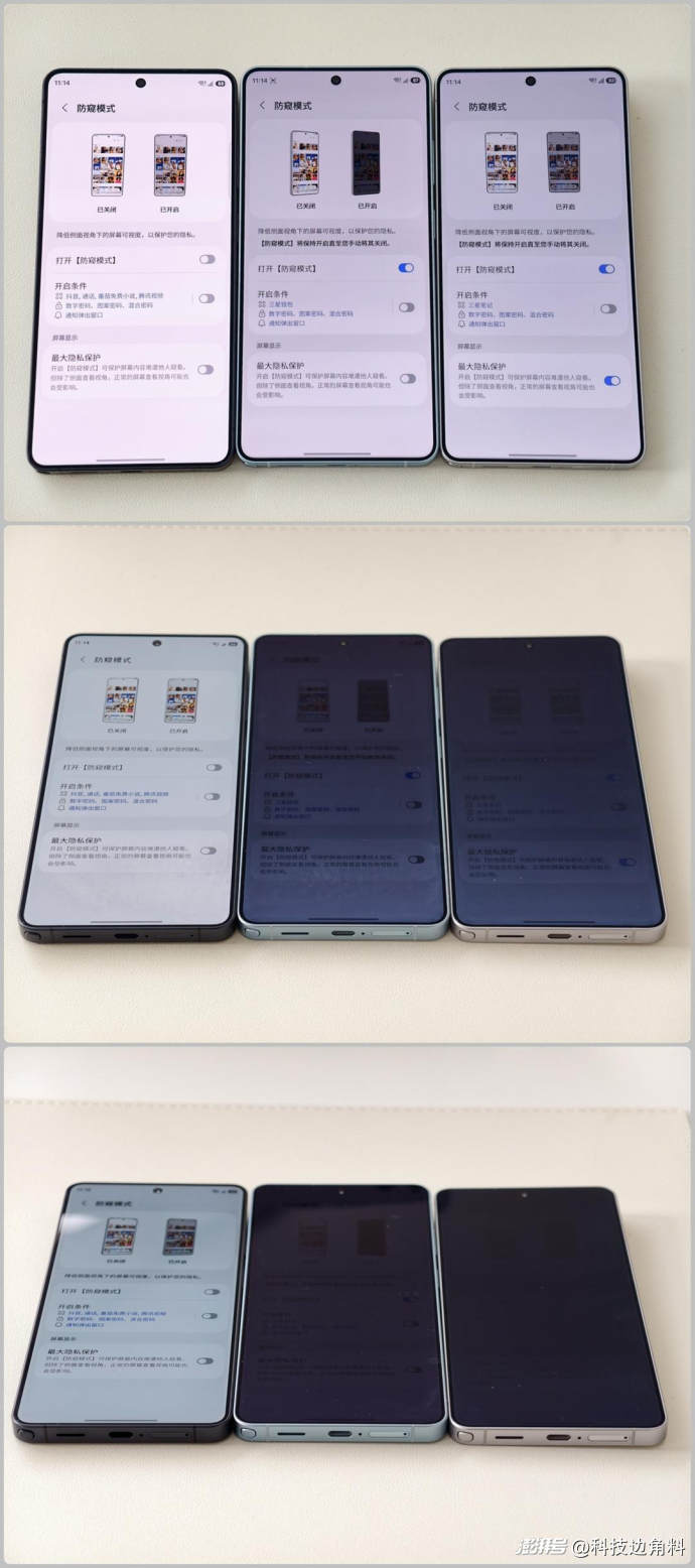 要知道當年三星的E5基材(小米12系列曾采用)因強加?棱微?鏡結構導?側致?視彩虹紋明顯,既然物理?面層?側視?減衰?解決不了,那不?干妨?脆搞個“硬件?窺防?屏”,反而成了獨家賣點。