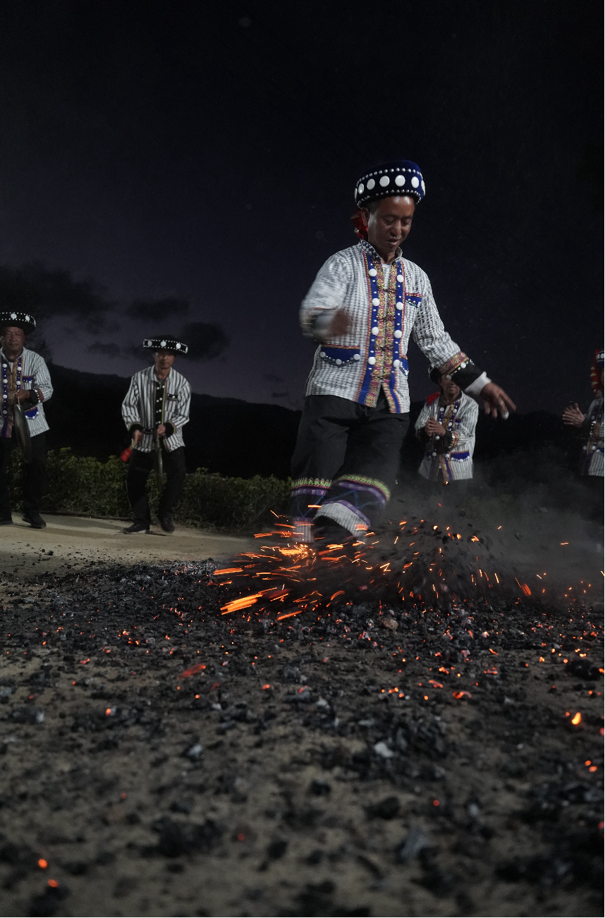 而李正雄,在2025年底第一次“下火海”(傈僳族非遺技藝,赤足踏過火炭),面對(duì)一地?zé)t的火炭,腳趾頭扣著地,恨不得就定在那里,不往前走一步,或者轉(zhuǎn)頭就跑。