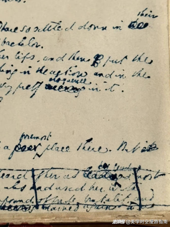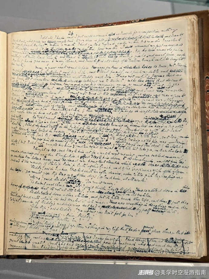 狄更斯《遠(yuǎn)大前程》的手跡,頁底刪除的部分:“再次見到她,又是四年之后了。我早已聽聞她的生活十分不幸,并且與丈夫分居。她的丈夫待她極為殘忍,其人傲慢、蠻橫與卑劣交織的惡名也遠(yuǎn)近皆知。后來我又聽說,她的丈夫死了(因虐待一匹馬而遭了意外),而她自己也己改嫁,嫁給了一個……”