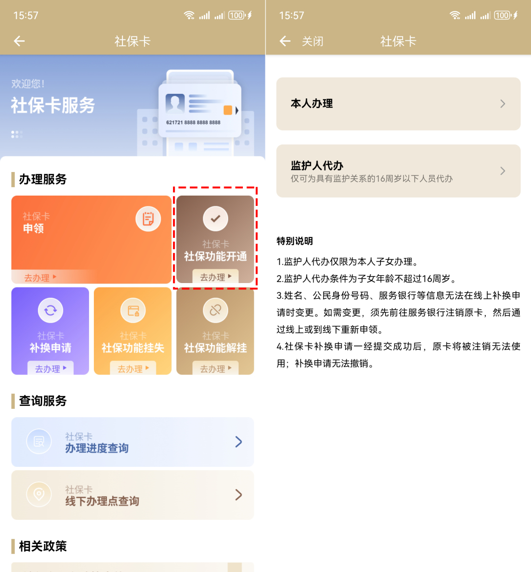 答:對于16周歲以下的未成年子女,無論通過線上還是線下渠道申請、開通社??ǎ氂杀O(jiān)護人辦理,孩子無須前往網(wǎng)點或自行操作。