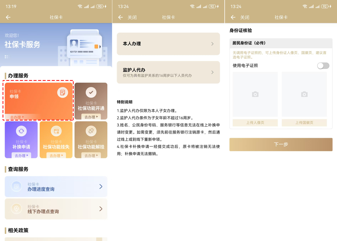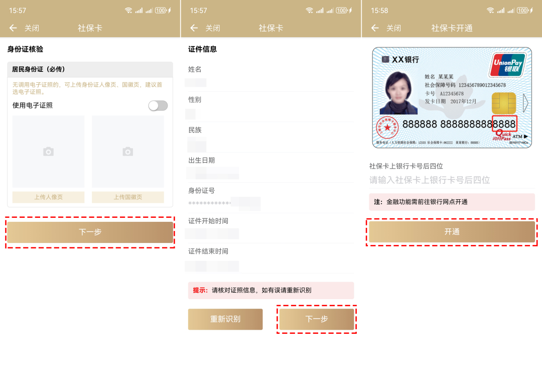 2、上傳身份證,點擊“下一步”→確認證件信息,無誤后點擊“下一步”→輸入社??ㄉ香y行卡后四位,點擊“開通”。