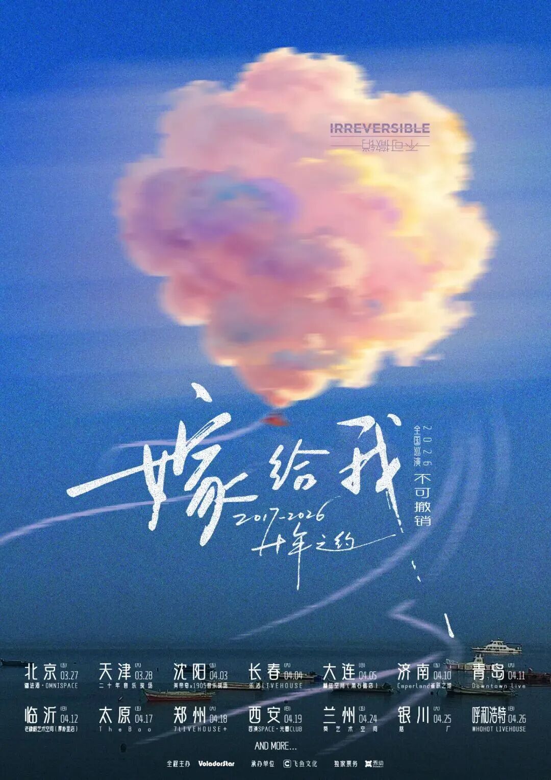 ?演出簡介:2017年,不可撤銷樂隊一曲《嫁給我》以熾烈告白與溫柔承諾,成為一代人的情感符號與求婚金曲,播放量破億。2026年,樂隊以“嫁給我”十年之約為主題開啟全國巡演,用音樂重聚共同記憶,兌現(xiàn)十年之約。