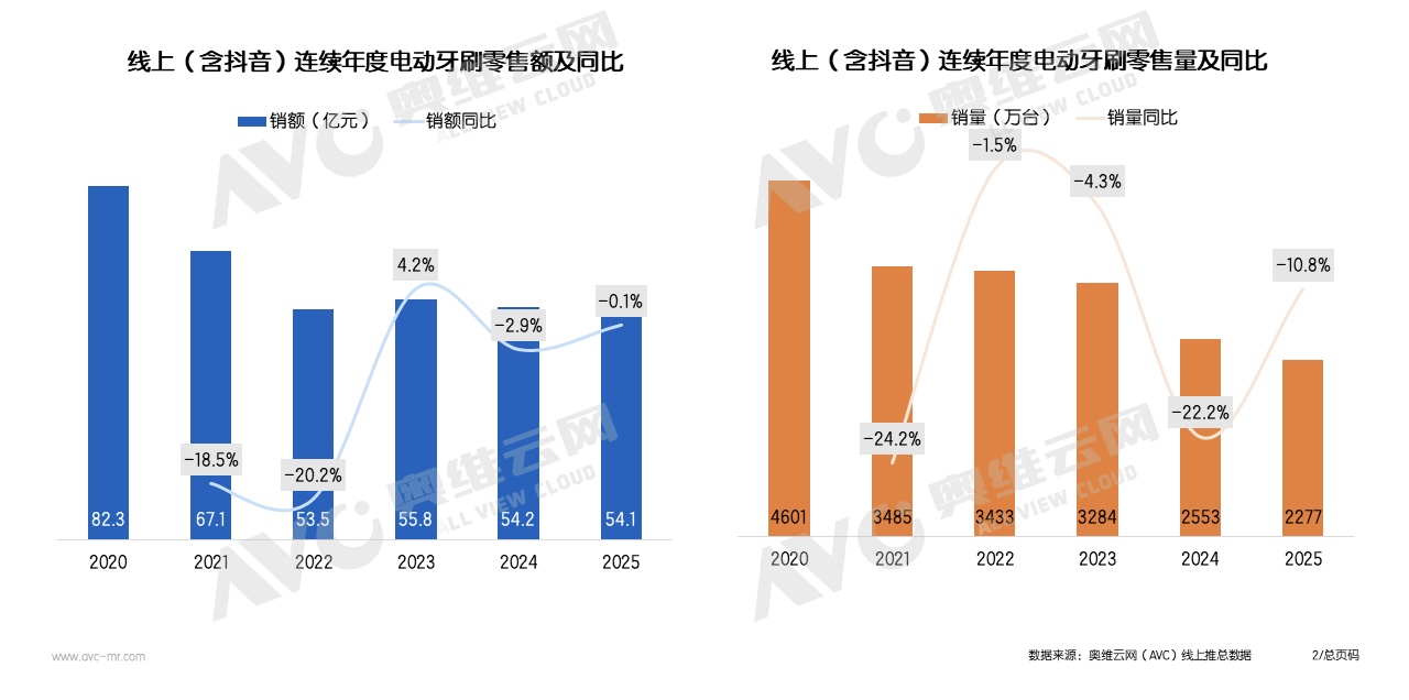 2025年,中國(guó)電動(dòng)牙刷線上市場(chǎng)總銷量2277萬支,同比下降10.8%;銷售額54.1億元,同比微跌0.1%。