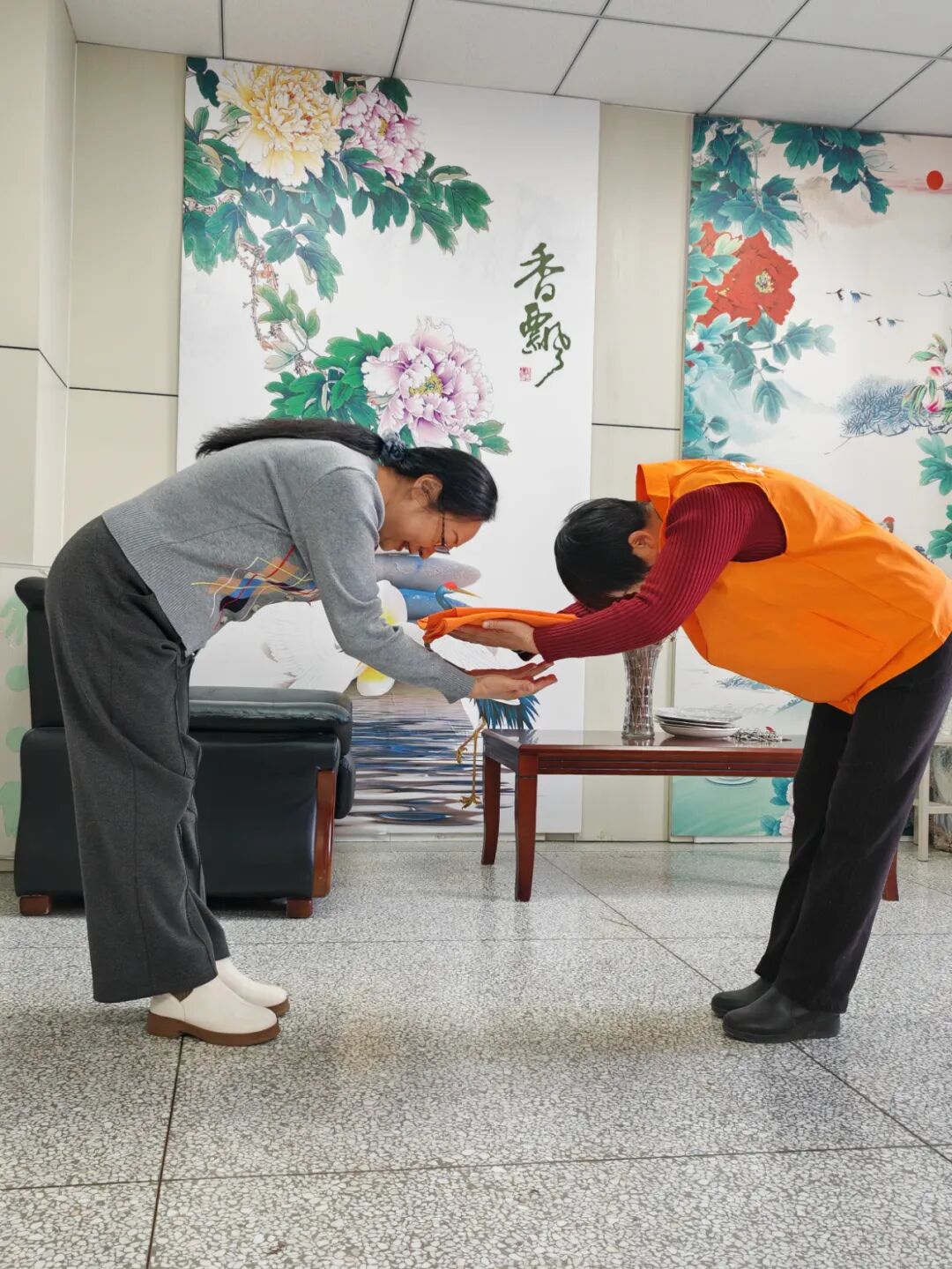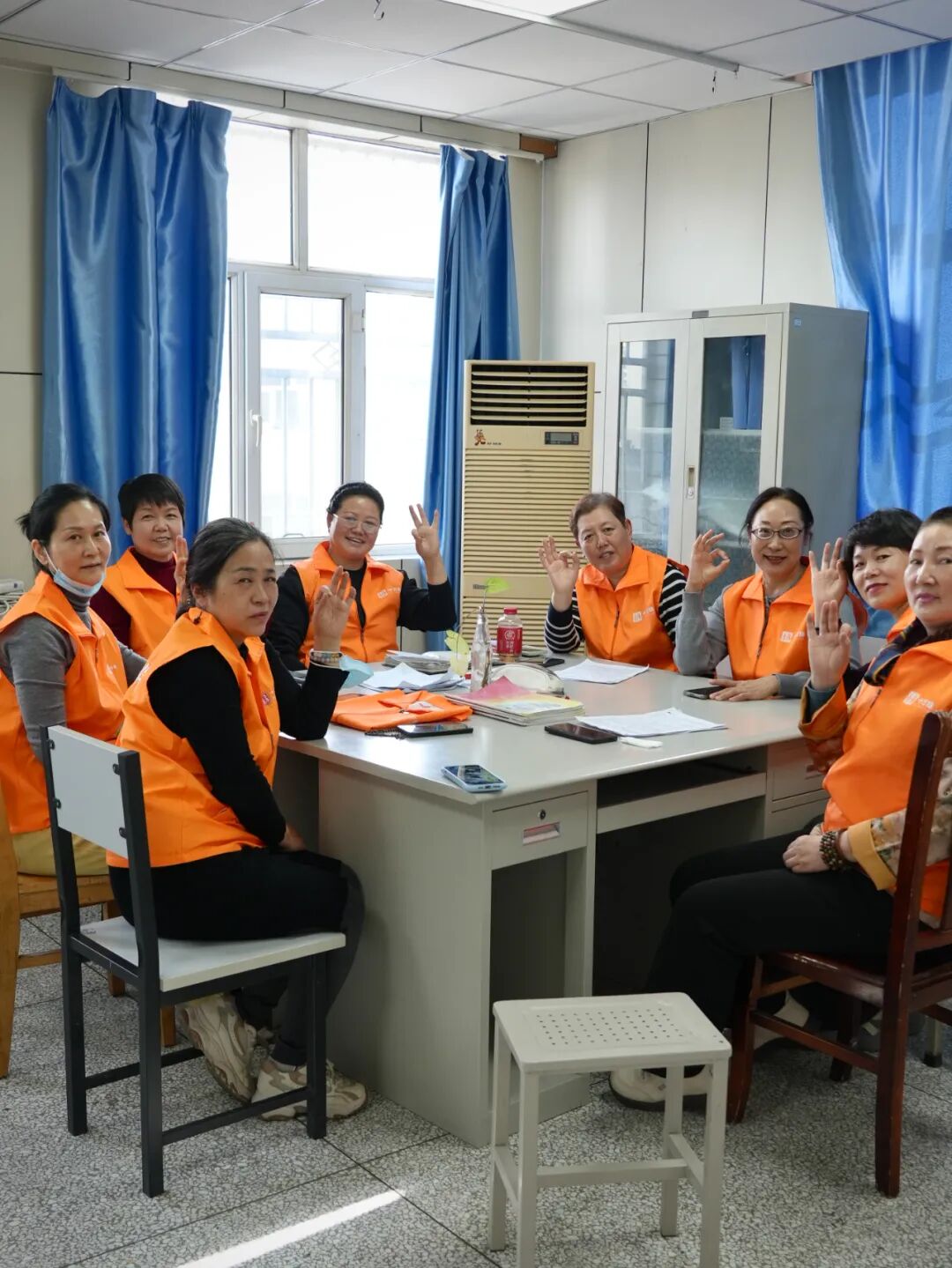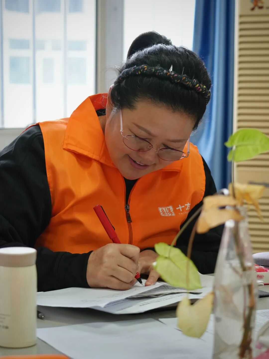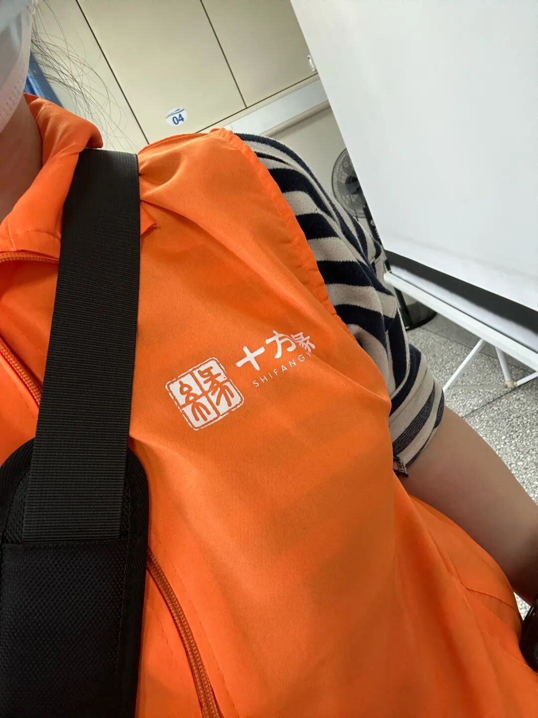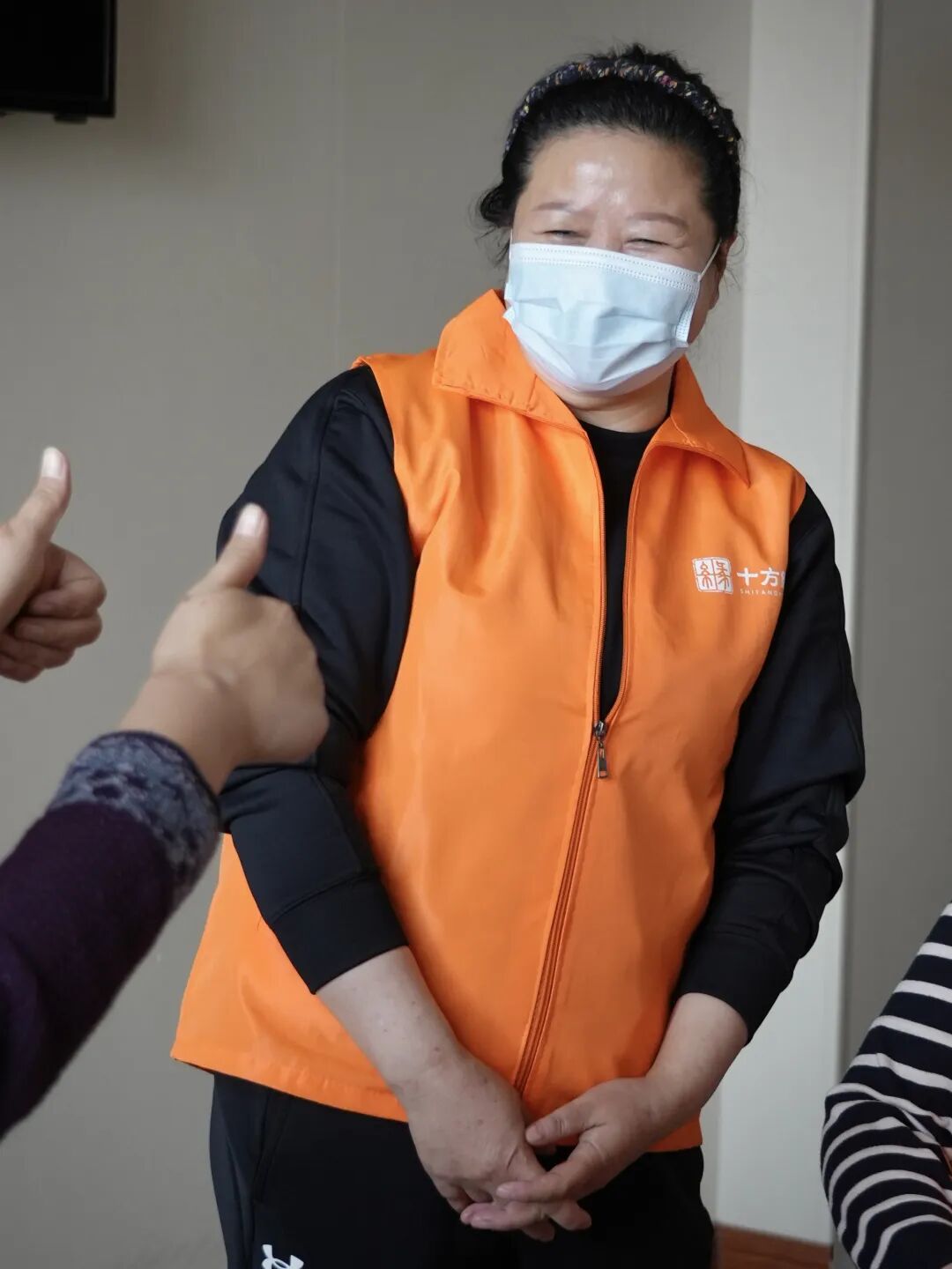 遞給我一件橙色的志愿者馬甲。