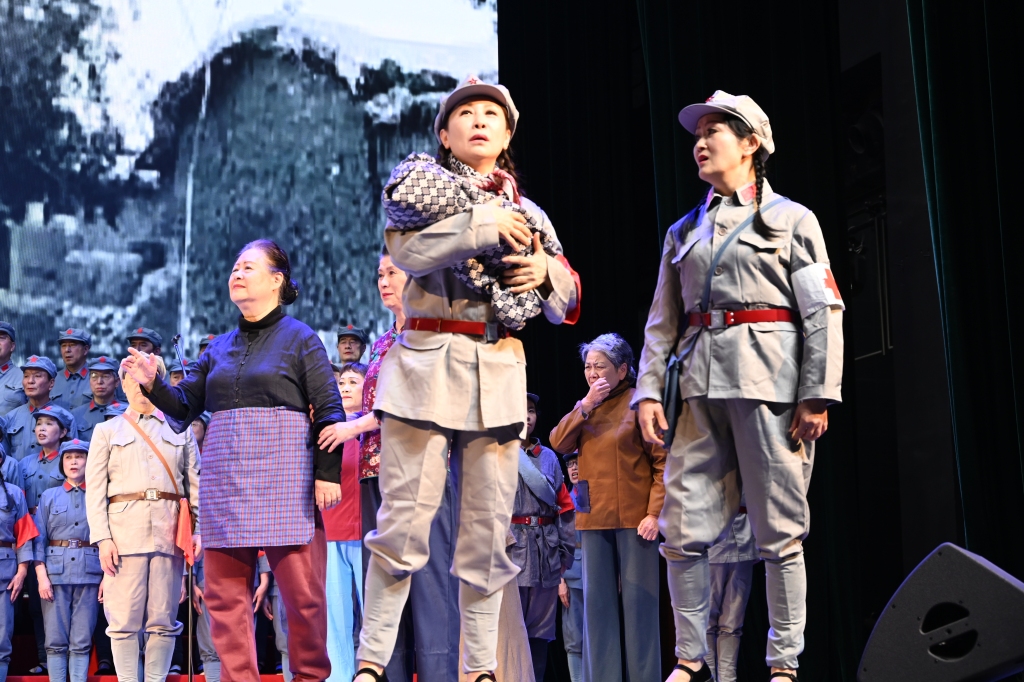 “路迢迢,秋風涼。敵重重,軍情忙。紅軍夜渡于都河,跨過五嶺搶湘江。三十晝夜飛行軍,突破四道封鎖墻。不怕流血不怕苦,前仆后繼殺虎狼?!奔で榘簱P的《長征組歌》在滬東工人文化宮劇場響起,臺上臺下氣氛熱烈。