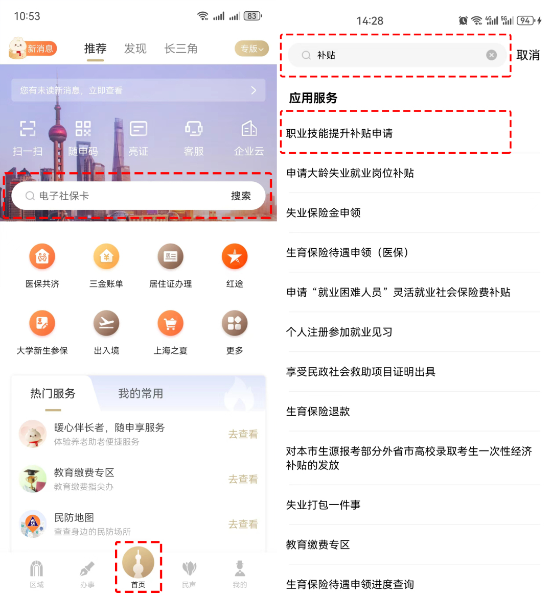 1、手機(jī)登錄“隨申辦市民云”APP→首頁搜索框中輸入“補(bǔ)貼”→點擊“職業(yè)技能提升補(bǔ)貼申請”進(jìn)入服務(wù)頁面;