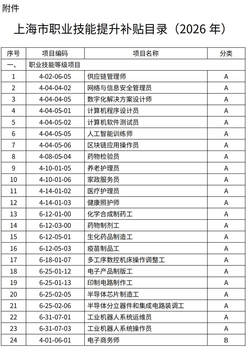 2026年上海市職業(yè)技能提升補(bǔ)貼目錄,3月1日起正式落地!
