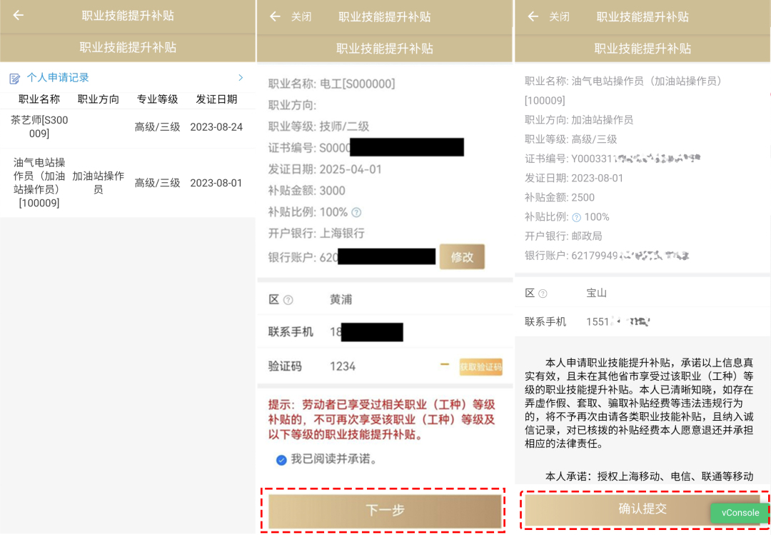 2、選擇申請補(bǔ)貼的職業(yè)技能名稱→確認(rèn)個人信息和補(bǔ)貼信息后,點擊“確認(rèn)提交”