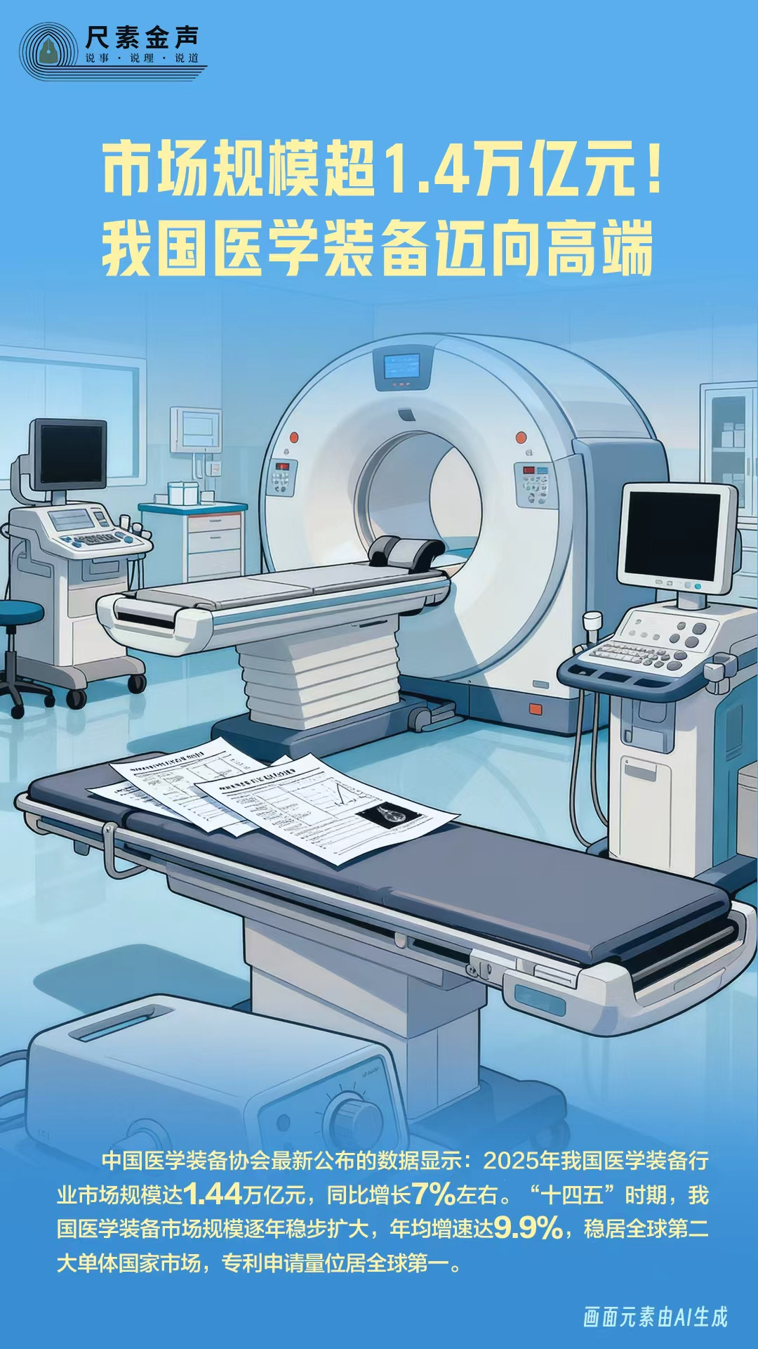 中國醫(yī)學(xué)裝備協(xié)會最新公布的數(shù)據(jù)顯示:2025年我國醫(yī)學(xué)裝備行業(yè)市場規(guī)模達(dá)1.44萬億元,同比增長7%左右?!笆奈濉睍r(shí)期,我國醫(yī)學(xué)裝備市場規(guī)模逐年穩(wěn)步擴(kuò)大,年均增速達(dá)9.9%,穩(wěn)居全球第二大單體國家市場,專利申請量位居全球第一。