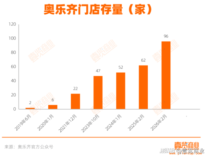 奧樂(lè)齊從2019年開(kāi)出全國(guó)首店到突破百家門(mén)店,用時(shí)近七年。前三年僅開(kāi)出9家,但2025年后明顯提速——2023年10月達(dá)47家,2024年1月增至52家,2025年2月達(dá)62家,到2026年2月已躍升至96家。過(guò)去一年新增34家,增速遠(yuǎn)超以往。