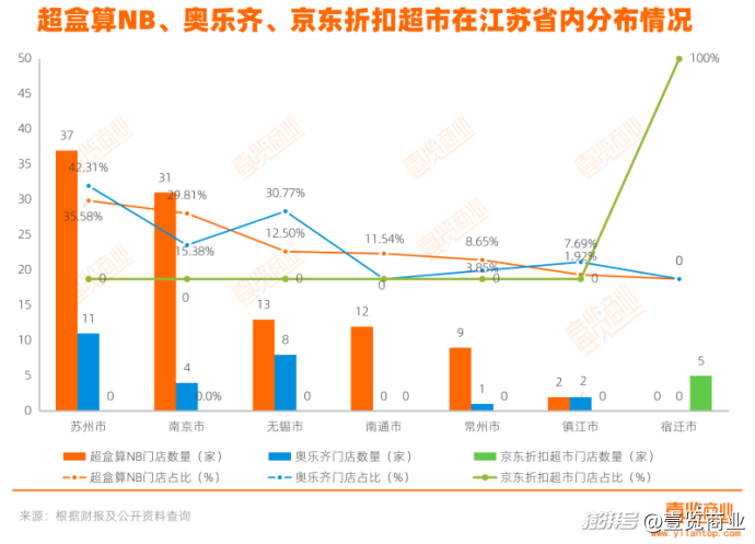 江蘇市場(chǎng)則呈現(xiàn)出“蘇南密集、蘇北空白”的特征。超盒算NB在江蘇共有104家門(mén)店,覆蓋南京、南通、常州、無(wú)錫、蘇州、鎮(zhèn)江六市;奧樂(lè)齊進(jìn)入南京、蘇州、無(wú)錫、常州、鎮(zhèn)江五城,共計(jì)26家門(mén)店。超盒算NB和奧樂(lè)齊均未布局蘇北市場(chǎng),而京東折扣超市則選擇在蘇北的宿遷市密集落子5家門(mén)店,形成差異化補(bǔ)充。