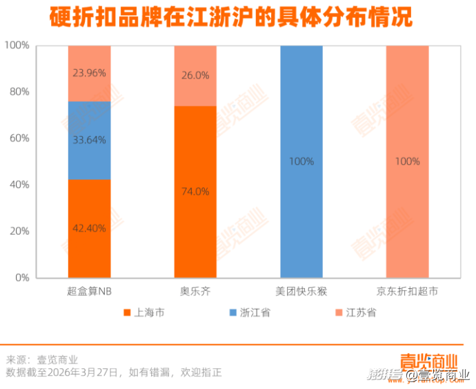 事實(shí)上,江浙滬已成為硬折扣品牌的必爭(zhēng)之地。據(jù)壹覽商業(yè)不完全統(tǒng)計(jì),截至3月27日,超盒算NB、奧樂(lè)齊、美團(tuán)快樂(lè)猴、京東折扣超市在該區(qū)域共布局548家門(mén)店,占各自品牌全國(guó)門(mén)店的50%以上。其中,上海以258家門(mén)店占據(jù)主導(dǎo),浙江、江蘇分別擁有155家和135家門(mén)店。