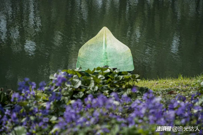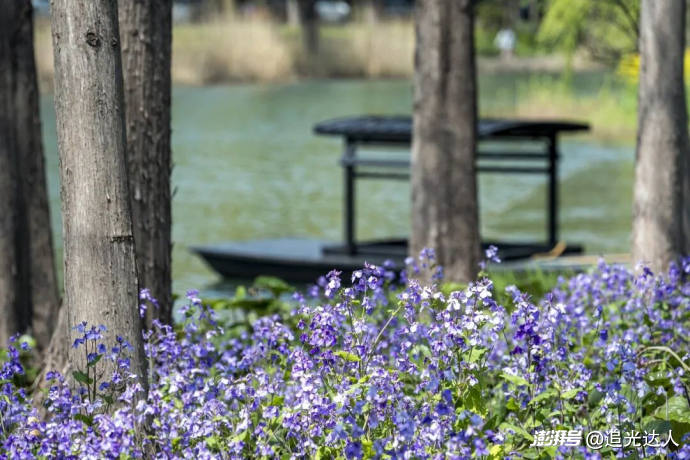 西門進(jìn)去不遠(yuǎn),左手邊是一大片緩坡。秋天時(shí)這里光禿禿的,只有些枯黃的草??涩F(xiàn)在,坡上鋪滿了紫色的花,密得幾乎看不見下面的泥土。二月蘭開得不張揚(yáng),每一朵都小小的,四片花瓣,紫白相間,像一群害羞的鄉(xiāng)下姑娘。可它們實(shí)在太多了,成千上萬朵擠在一起,從坡底水岸一直漫到坡頂,又從坡頂傾瀉下去,像誰打翻了一罐紫色的顏料。