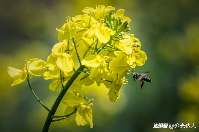 再往前走,視野忽然開闊。一片油菜花田就在路邊,開得正盛。那種黃,濃烈得幾乎要流淌下來,和二月蘭的含蓄全然不同。蜜蜂在花間忙碌著,嗡嗡的聲音織成了一張細(xì)密的網(wǎng)。我找了高高的一顆花蕾,舉起相機(jī),讓油菜花占據(jù)前景,遠(yuǎn)處的花海、柳樹虛化成一片嫩綠,再遠(yuǎn)處,是濕地的水面,亮晶晶的,像一面碎了的鏡子。