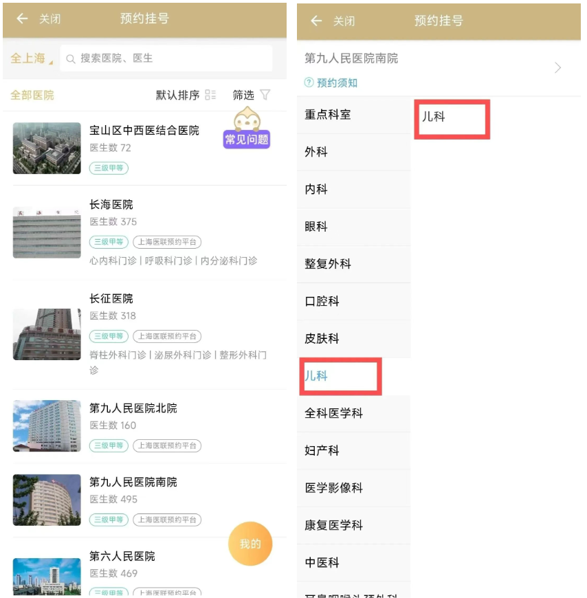 第二步:搜索想去的醫(yī)院,也可按條件進(jìn)行篩選(按距離、醫(yī)院等級(jí)篩選),隨后點(diǎn)擊進(jìn)入科室頁(yè)面選擇目標(biāo)科室。