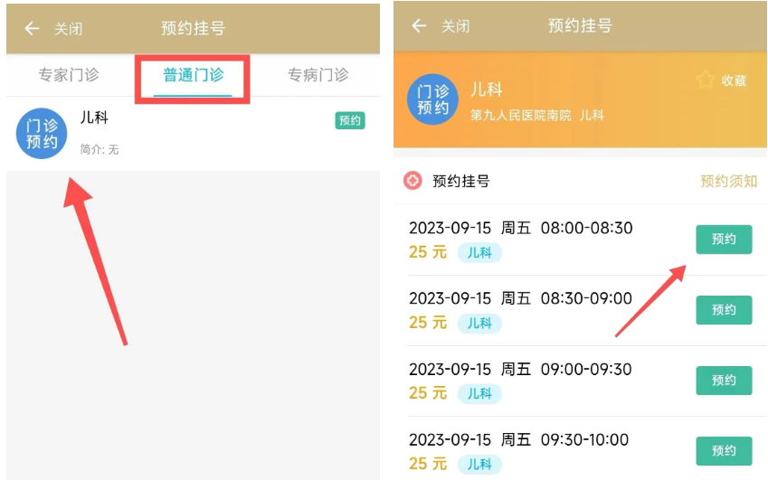 第三步:可選擇專家門(mén)診、普通門(mén)診、專病門(mén)診,這里我們以選擇普通門(mén)診為例,選擇合適的時(shí)間段點(diǎn)擊“預(yù)約”后,按照提示填寫(xiě)個(gè)人信息添加就診卡即可。