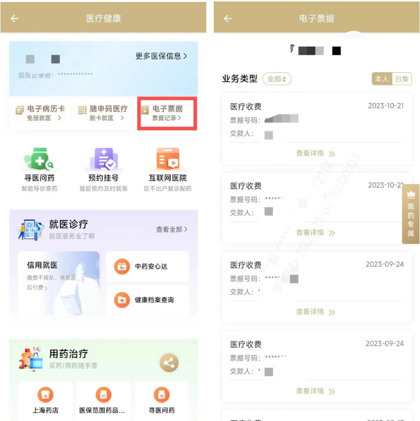 電子票據(jù):點(diǎn)擊進(jìn)入【電子票據(jù)】服務(wù),即可查看往期醫(yī)療付費(fèi)記錄。