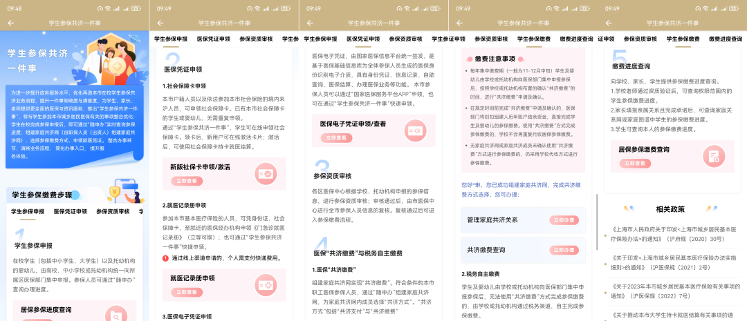 2、學(xué)生在校完成參保申報后,可以通過“一件事”查詢當(dāng)前參保辦理進(jìn)度、申領(lǐng)醫(yī)保憑證入口、建立家庭共濟(jì)網(wǎng)并選擇共濟(jì)方式、查詢繳費(fèi)進(jìn)度以及了解相關(guān)政策。