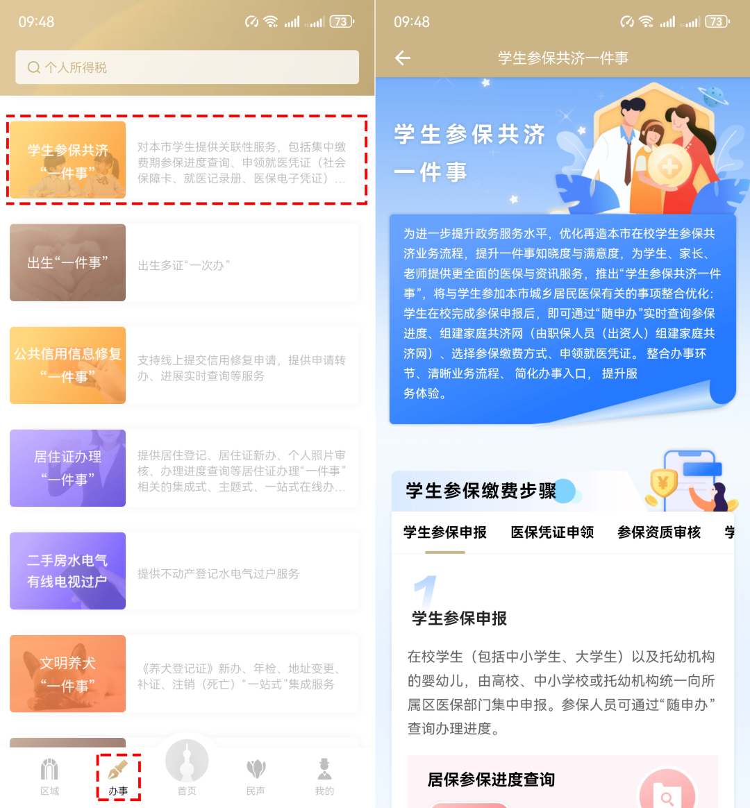 1、登錄“隨申辦市民云”APP→進(jìn)入“辦事”頻道→點擊“學(xué)生參保共濟(jì)一件事”,進(jìn)入專題事項;