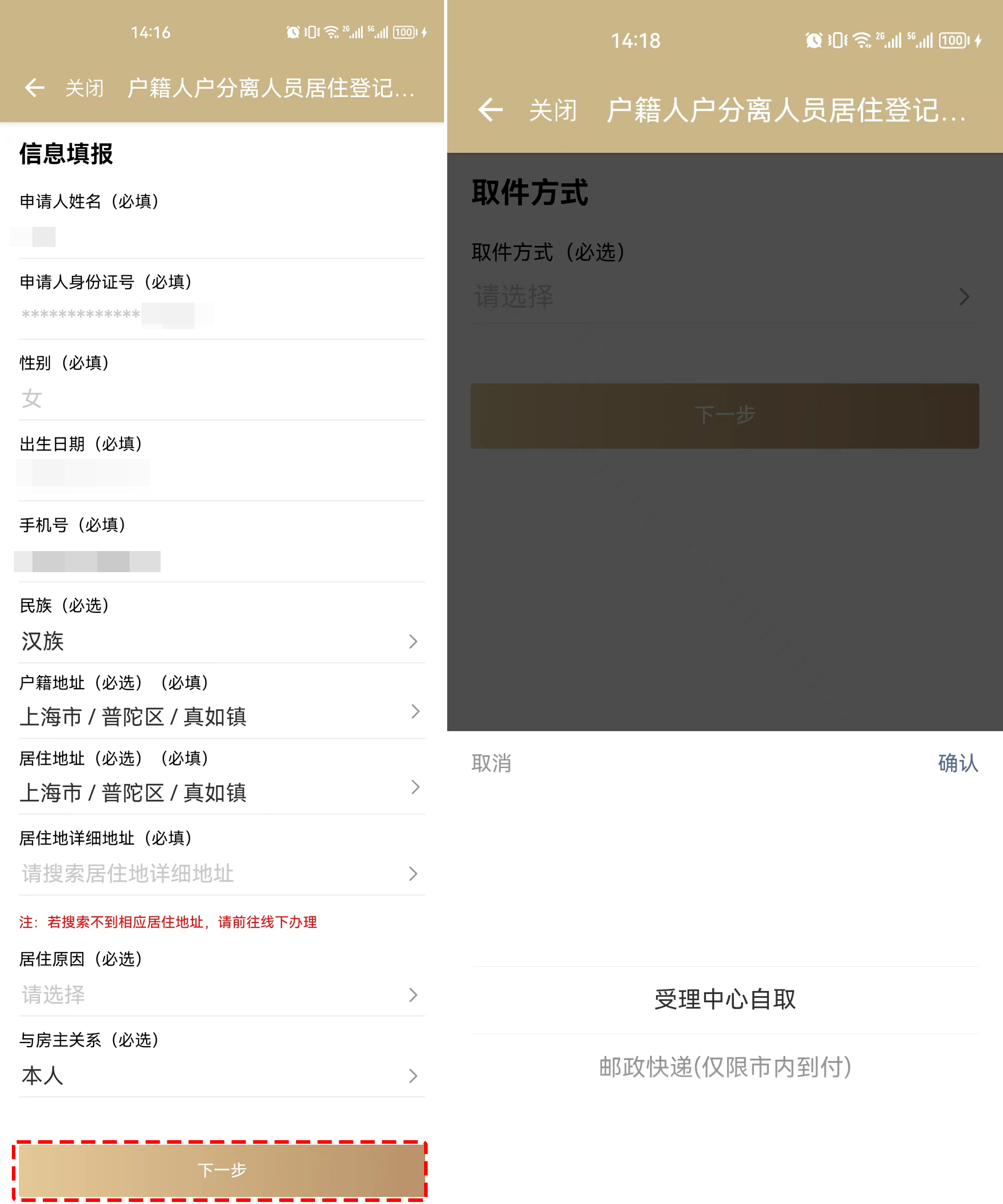 點擊“戶籍人戶分離人員居住登記受理”→查看辦理須知,點擊“我已知曉,立即受理”→信息填報處,確認(rèn)辦理方式和住所種類后,點擊“下一步”;