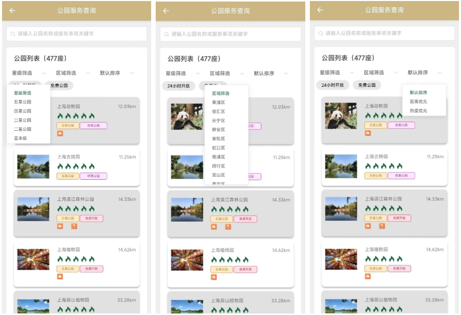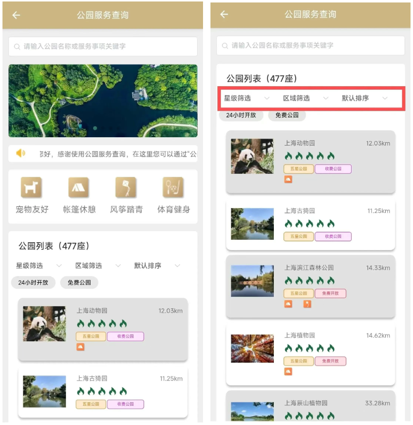 第二步:進(jìn)入服務(wù)后,可以按照星級(jí)、區(qū)域進(jìn)行條件篩選查找心儀的公園。
