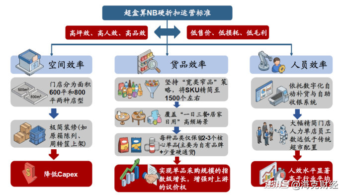 就模式而言,超盒算NB錨定的硬折扣,即通過優(yōu)化供應(yīng)鏈、發(fā)展自有品牌、精簡SKU等方式,結(jié)構(gòu)性壓縮成本,長期穩(wěn)定提供低價(jià)商品。據(jù)官方資料,超盒算NB經(jīng)營生鮮、3R(即食、即熱、即烹)、凍品、休閑食品等品類,SKU約1500款,自有品牌占比達(dá)60%。