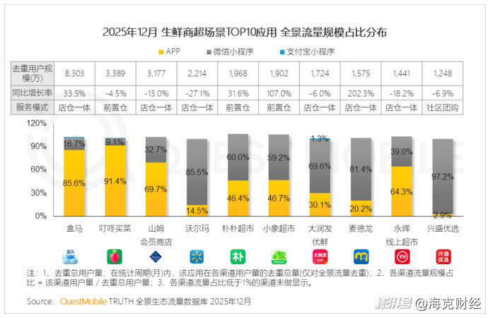 調(diào)研機(jī)構(gòu)QuestMobile數(shù)據(jù)顯示,在2025年12月國內(nèi)生鮮商超場(chǎng)景應(yīng)用榜單上,盒馬以MAU(月活躍用戶)8303萬居于首位,同比增長33.5%;叮咚買菜和山姆會(huì)員商店分列第二、三位,MAU為3389萬和3177萬;排名第四至第九位的是沃爾瑪、樸樸超市、小象超市、永輝線上超市等應(yīng)用,MAU在1400萬-2200萬。