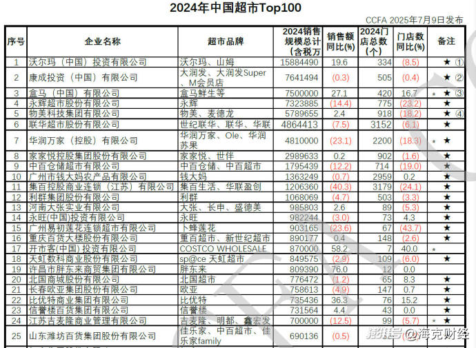 據(jù)中國連鎖經(jīng)營協(xié)會(huì)2025年7月發(fā)布的2024年度國內(nèi)超市TOP100榜單,盒馬躋身國內(nèi)第三,第一是沃爾瑪,第二是大潤發(fā)背后的康成投資,再后面是永輝、物美、華潤萬家等。而在2023年與2024年發(fā)布的同維度榜單上,盒馬排在第六與第八位。換言之,盒馬業(yè)內(nèi)座次已有明顯提升。