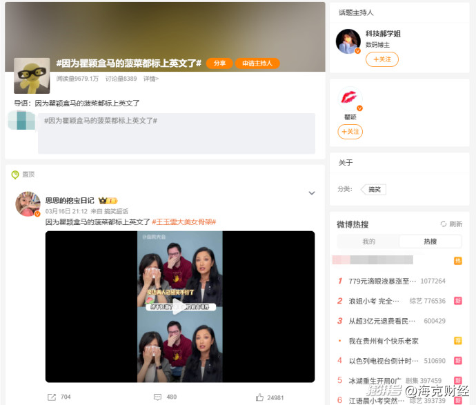 就在23天前的3月16日,盒馬還曾因“菠菜?!钡巧衔⒉崴?。相關(guān)詞條出自知名博主papi醬的訪談節(jié)目《papi熱烈歡迎》。演員瞿穎在參加該節(jié)目時(shí),描述自己曾將泰國攤主詢問的“菠菜(Spinach)”誤聽為“西班牙人(Spanish)”,還現(xiàn)場(chǎng)模仿泰式口音。節(jié)目視頻爆火出圈,在抖音、快手、小紅書等平臺(tái)累計(jì)點(diǎn)贊量超過135萬。盒馬迅速跟進(jìn),特地在應(yīng)用端的菠菜商品描述中添加了“菠菜Spinach”的標(biāo)簽,“因?yàn)轹姆f盒馬的菠菜都標(biāo)上英文”話題隨之在微博躥紅。