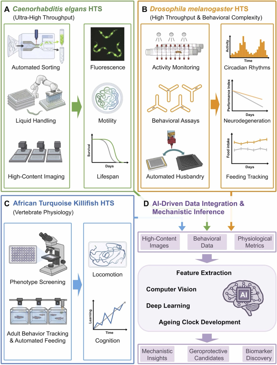 本綜述聚焦于與人類(lèi)衰老機(jī)制高度保守的短壽命模型:線蟲(chóng)與果蠅,并重點(diǎn)探討了非洲鳉魚(yú)這一脊椎動(dòng)物“新星”在橋接轉(zhuǎn)化醫(yī)學(xué)中的關(guān)鍵作用,提出了一套整合多組學(xué)、自動(dòng)化監(jiān)控與AI視覺(jué)推理的“抗衰藥物發(fā)現(xiàn)新范式”。