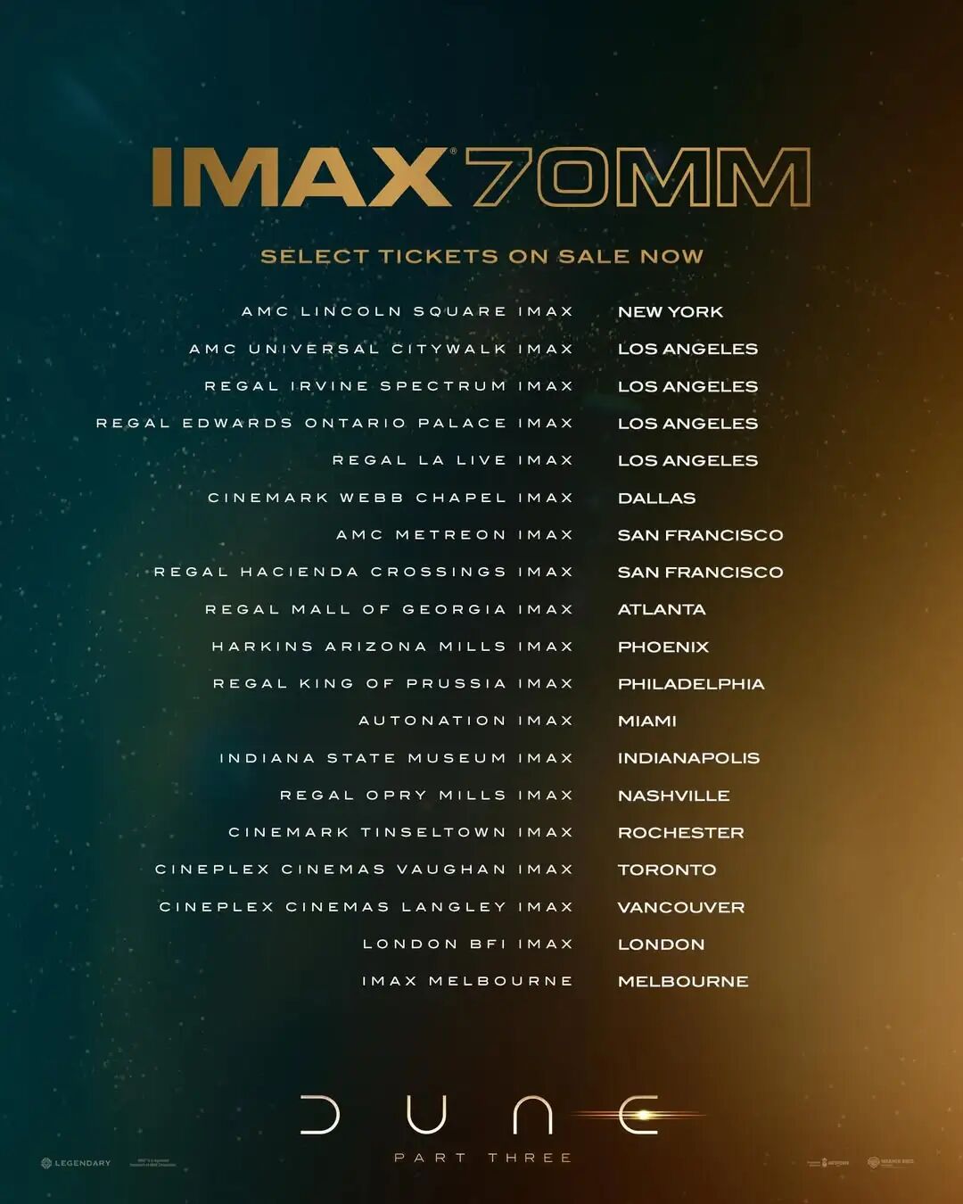 上周,華納突然放出了《沙丘3》70mm膠片IMAX影廳的首批預(yù)售票,盡管距離影片在北美上映(12月18日)還有8個月的時間。