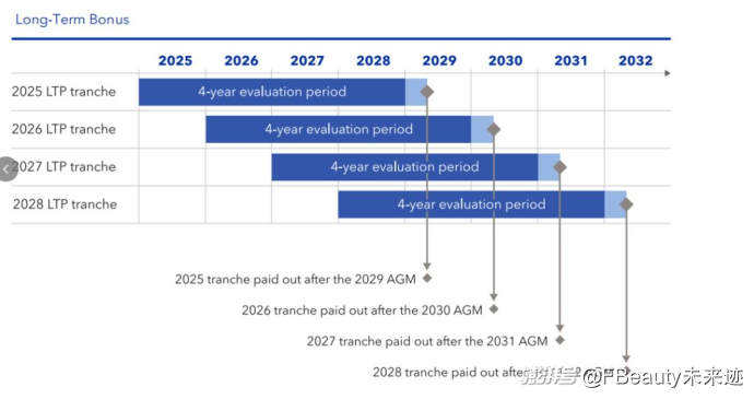 具體而言,拜爾斯道夫在常規(guī)LTP之外,專門增設了“LTP 2025—2029”額外檔位,目標總薪酬按比例分攤至整個2025—2029年評估周期。這一結構意味著CEO的薪酬兌現(xiàn)周期最長可達5年。