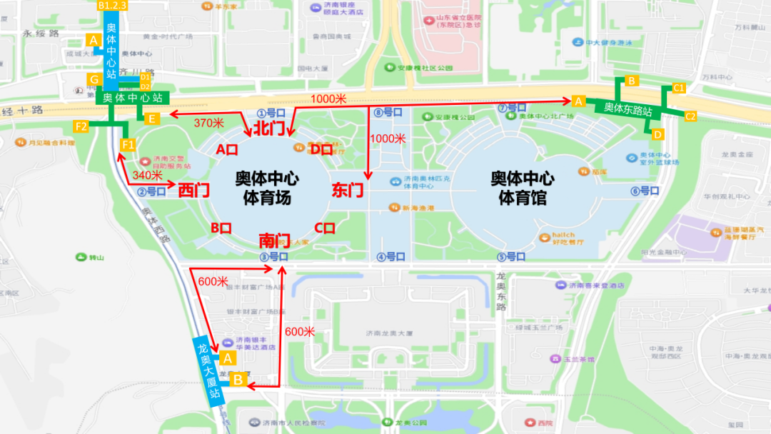 赴奧體中心體育場(chǎng)的乘客,具體指引請(qǐng)看下面這張指示圖(內(nèi)含奧體中心體育場(chǎng)各出入口標(biāo)識(shí),輕松直達(dá)不繞路)。