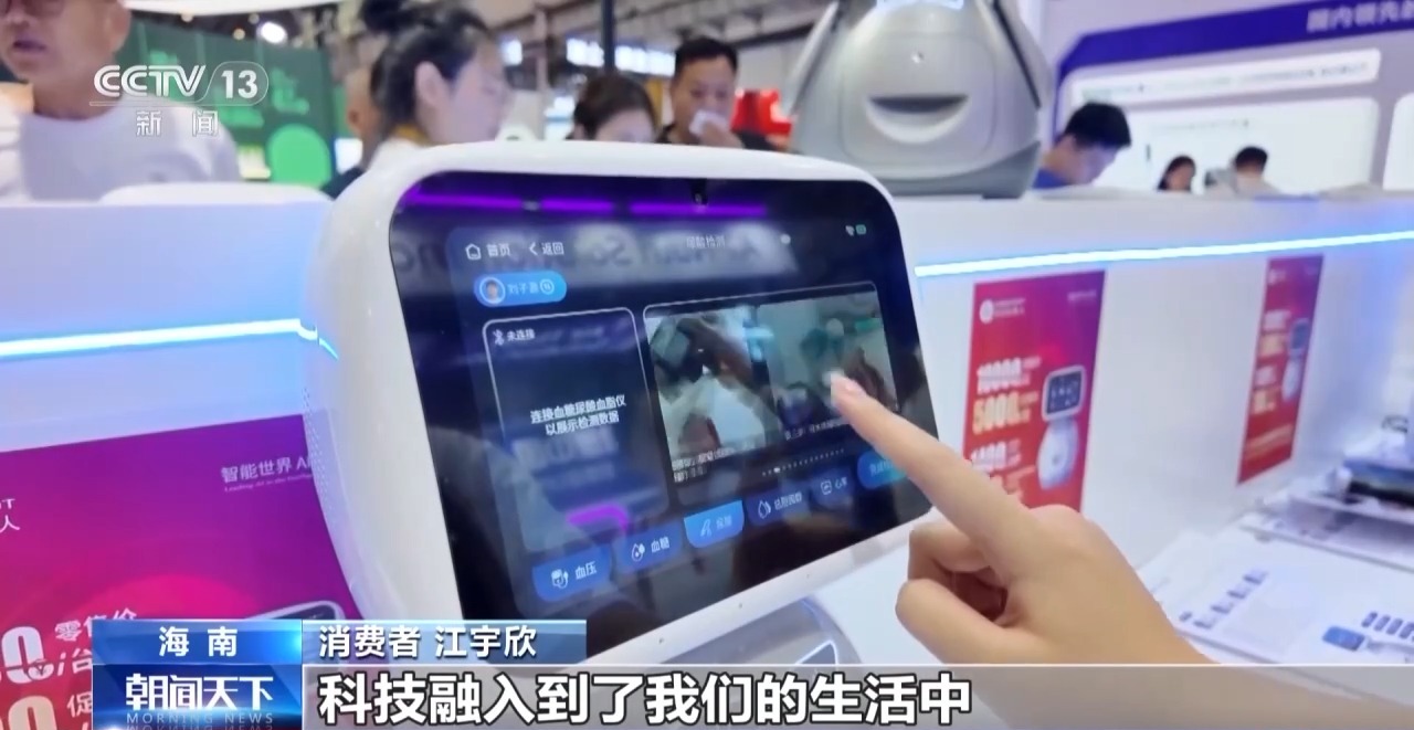 本屆消博會首次設(shè)立科技消費展區(qū),AI機器人等一系列智能產(chǎn)品讓觀眾感受前沿科技的魅力。在健康消費展區(qū),一臺醫(yī)療機器人吸引了不少觀眾駐足體驗。一位女士正跟著屏幕提示一步步操作,血壓等身體數(shù)據(jù)很快就顯示出來。