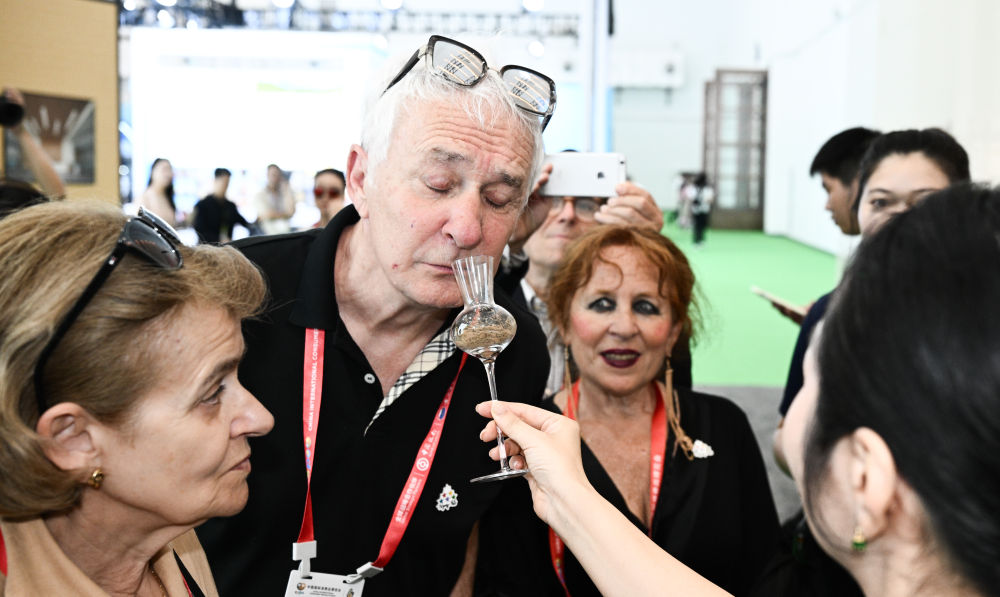 4月13日,觀眾在第六屆消博會(huì)主會(huì)場(chǎng)品鑒沉香。 楊冠宇 攝