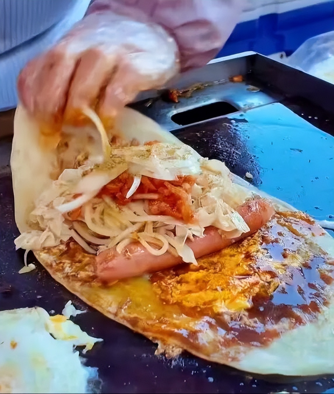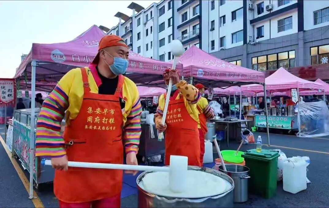 熱氣最能撫慰春寒。早餐攤前,香氣直沖鼻腔。金黃酸湯子順工具滑入沸水,撈起澆上鮮爽湯汁,酸辣開(kāi)胃,一口暖到心底。師傅揮槌敲打糯米,打糕軟糯彈牙,裹上豆面,甜香在舌尖化開(kāi)。奶白羊湯慢火熬煮,不腥不膻,配剛出爐的燒餅,是抵御東北晨涼的絕佳滋味。還有油條、豆?jié){、朝鮮族米腸、集安特色雞蛋餅,每一口,都是地道的集安味道。