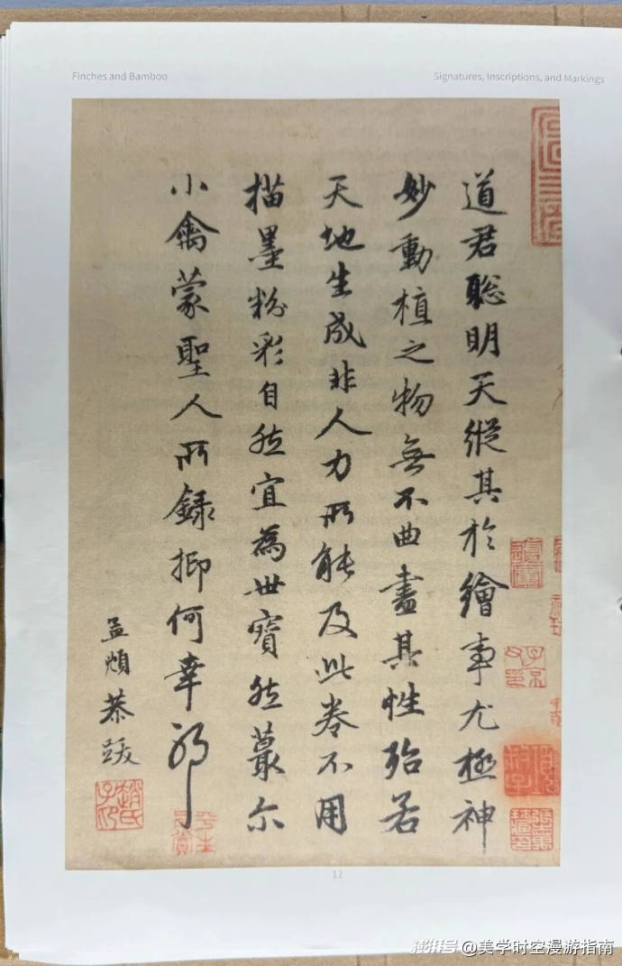 題跋本身也是一件優(yōu)秀的行書作品,體現(xiàn)了趙孟頫典型的 “趙體” 風(fēng)格:用筆圓潤流暢,結(jié)體寬綽秀美,章法疏朗勻稱,是元代館閣體書法的典范。這件題跋與徽宗的畫作相得益彰,構(gòu)成了書畫合璧的完整作品,也讓《竹禽圖》的流傳脈絡(luò)更加清晰。